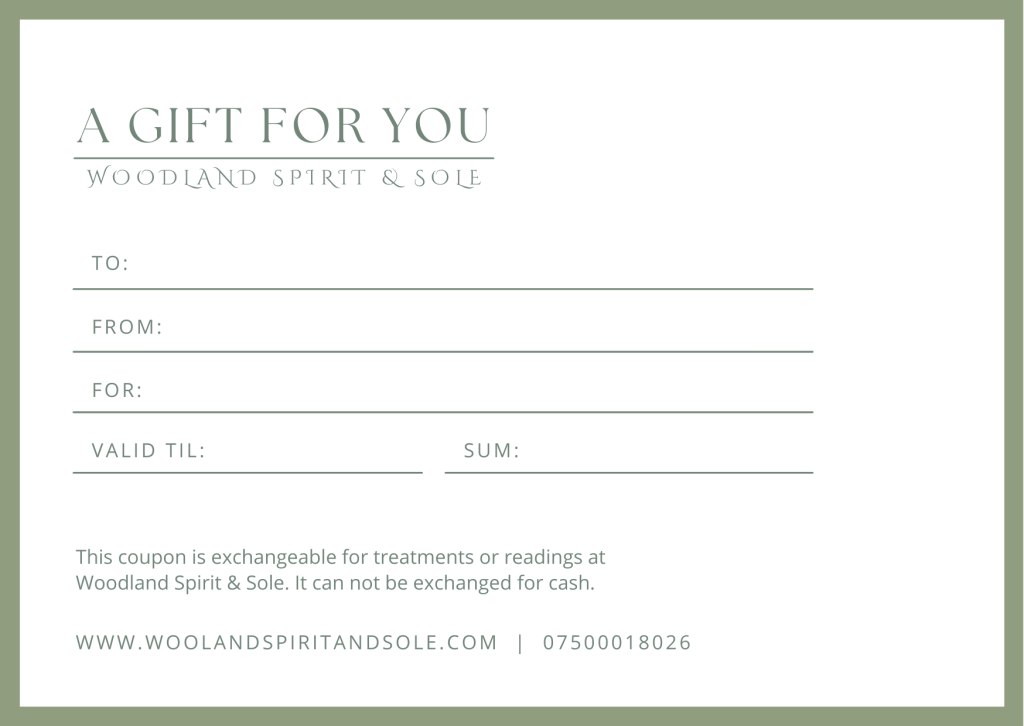 Please email woodlandspiritandsole@gmail.com if you would like to purchase a gift voucher or pick one up from me direct. I am happy to post direct to the recipient at no extra cost.
